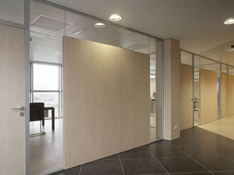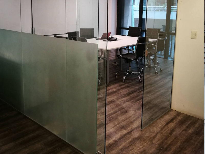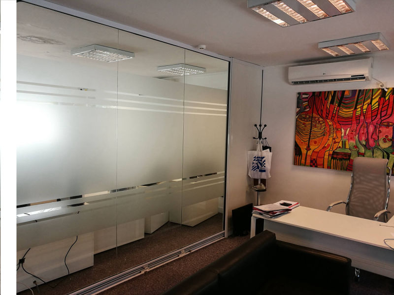 Se logra por medio el armado de módulos colocados en forma continuada de piso a loza como también a altura de puerta más un paño fijo superior. Los mismos son transparentes aptos para recibir un lamina esmerilada o ploteado artístico ,cortinas de aluminio o roller .